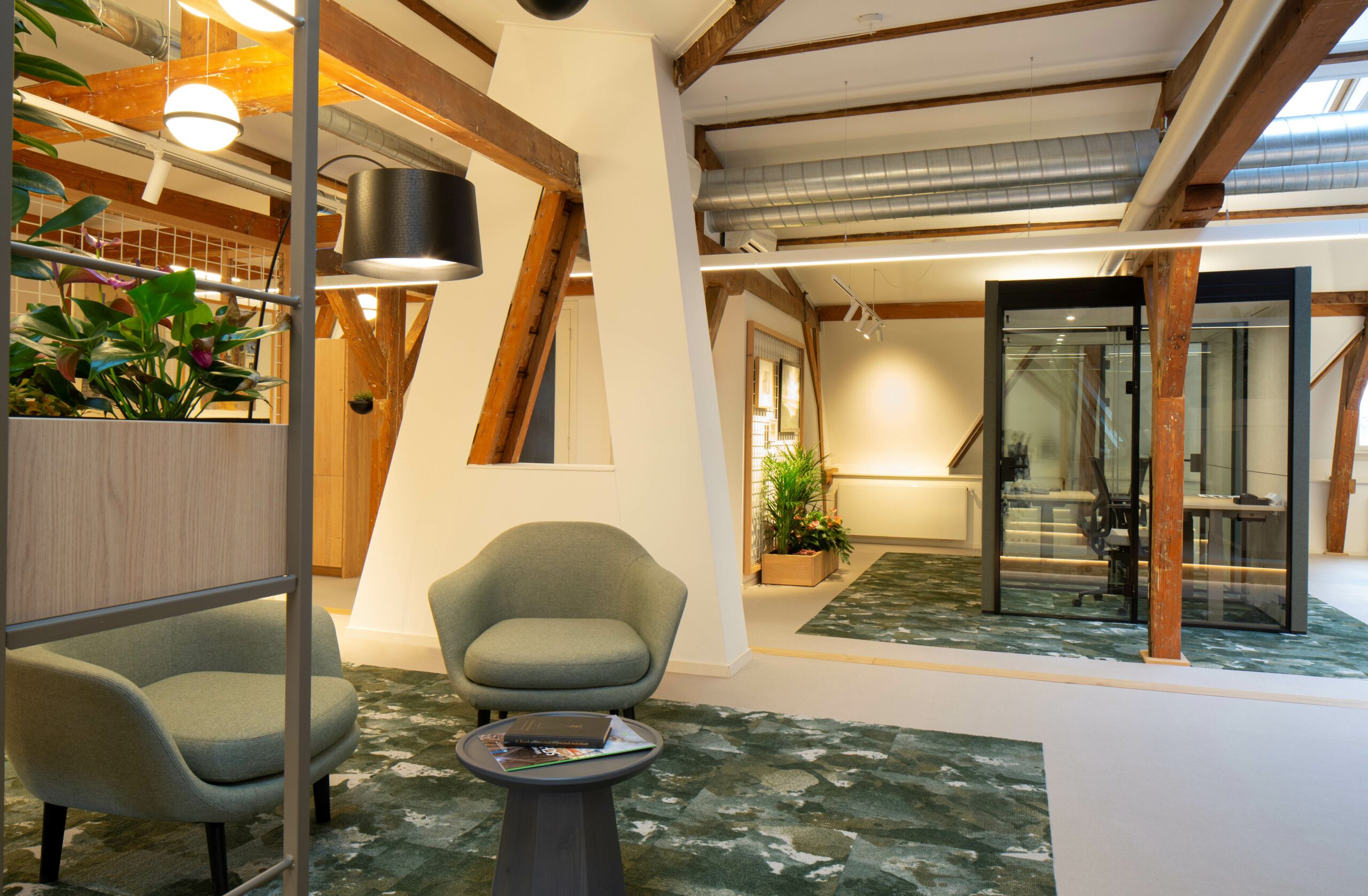 De nieuwe zolderverdieping is een mooie plek geworden waar medewerkers met plezier kunnen werken en de productiviteit zal worden vergroot. Door het toevoegen van de concentratie-units, representatief en comfortabel meubilair, een professionele vloer en werkplek bekabeling is er een ruimte gecreëerd die echt aan álle eisen voldoet. Zie de foto’s van René Gonkel voor een impressie van dit mooie, nieuwe kantoor.