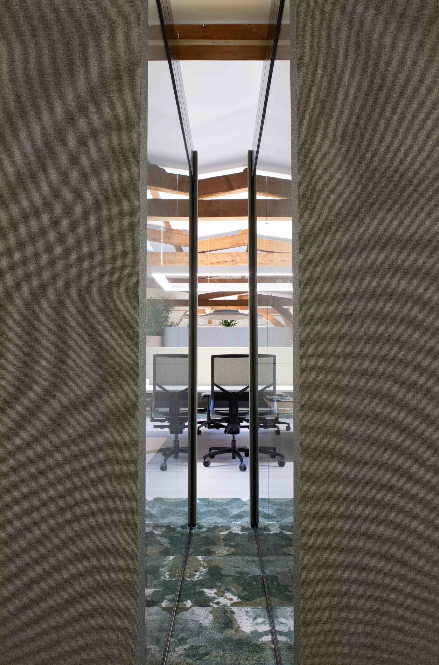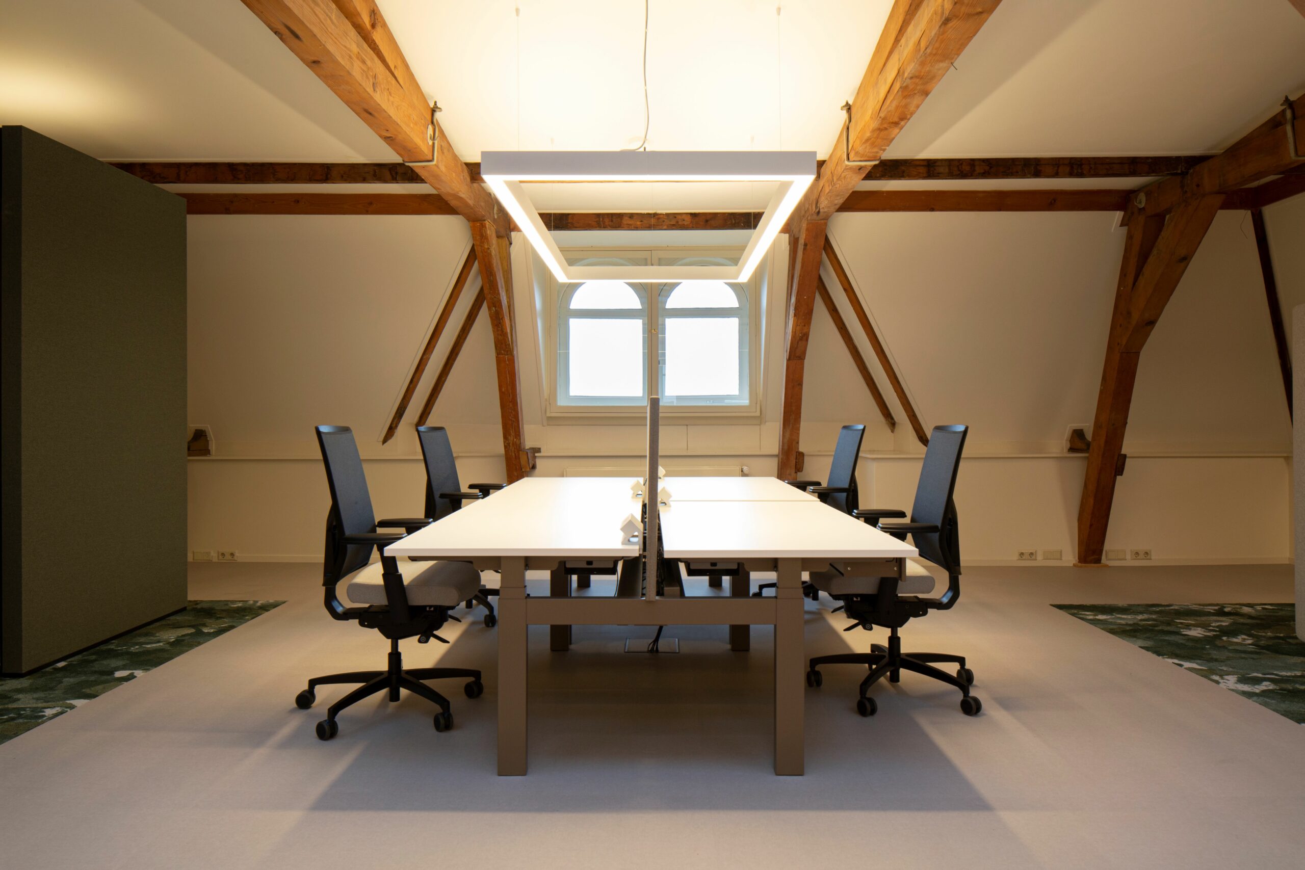 Er is gekozen voor een pvc vloer om de kantoorzolder een nette en professionele uitstraling te geven. De toevoeging van tapijt bij de werkplekken en in de ontmoetings- en overlegruimtes, heeft gezorgd voor een mooie aankleding van het kantoor. Verder is er geïnvesteerd in goede werkplek bekabeling. Zo zijn de werkplekken niet alleen optimaal verstelbaar, maar ook veilig en netjes.