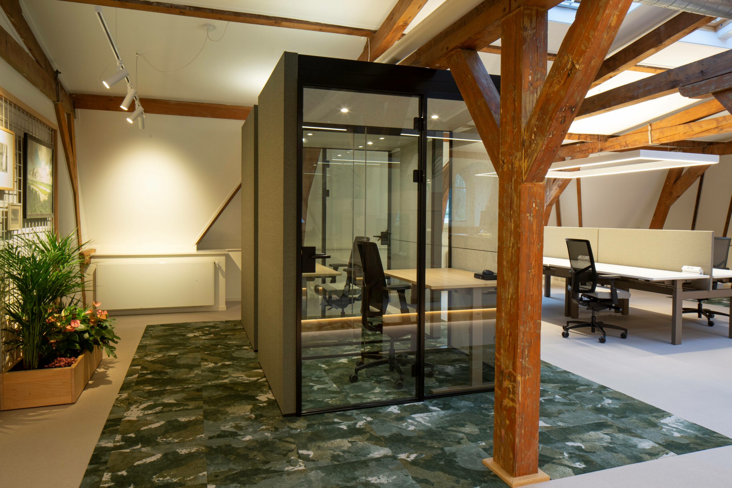 De implementatie van units van Stilldesign zorgt ervoor dat er geconcentreerd gewerkt kan worden. In deze concentratie-units kunnen medewerkers rustig in een Teams overleg of hem gebruiken als stilteruimte om even alleen en ongestoord te werken.
